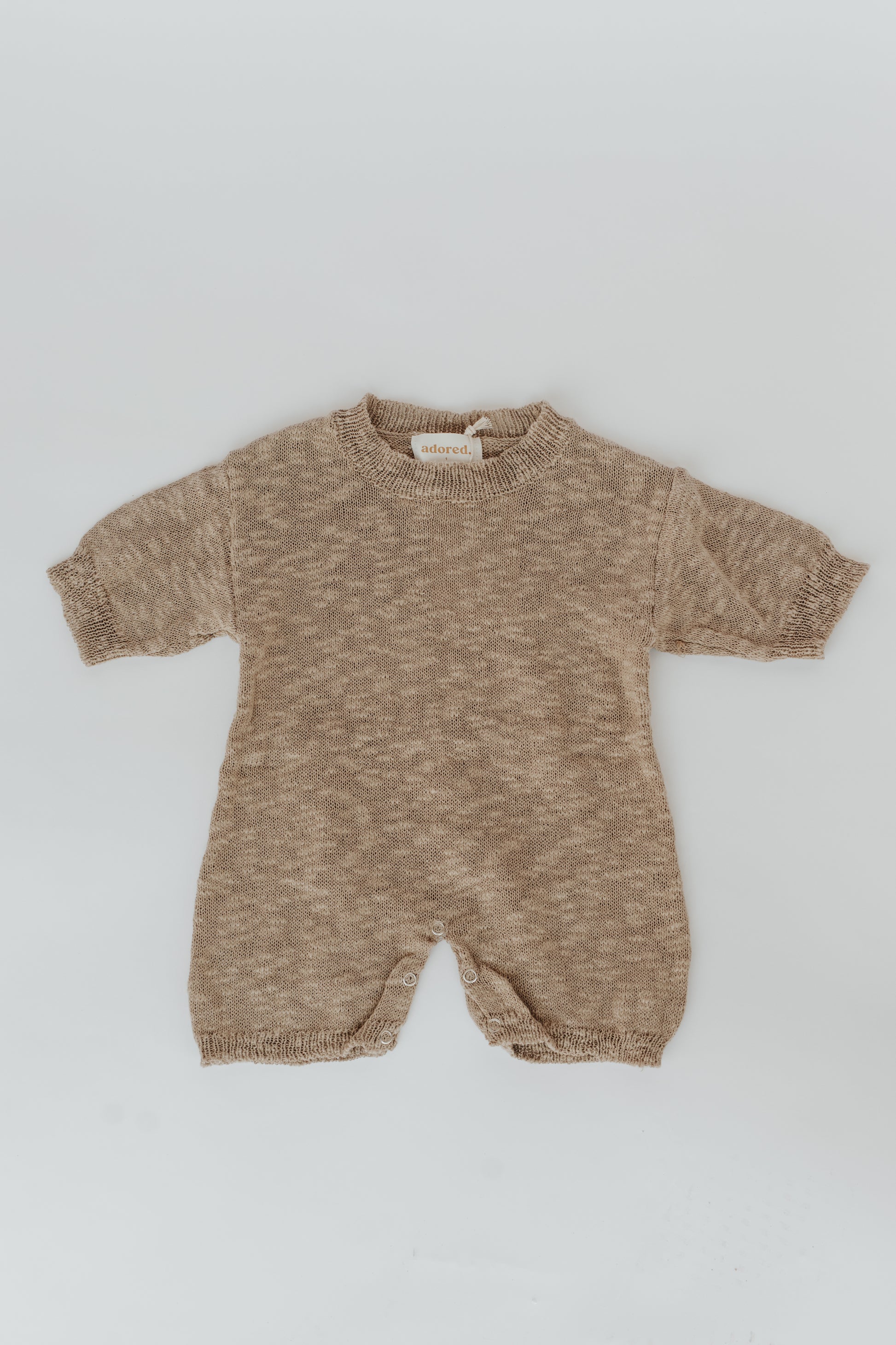 Lightweight knitted short sleeve romper with snap closure on bottom.
